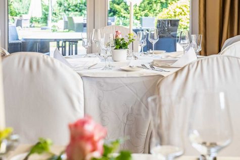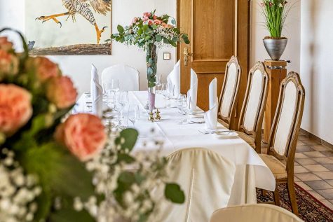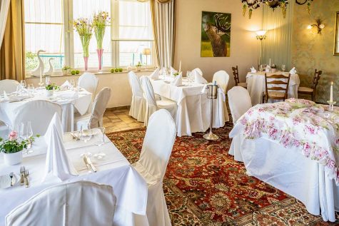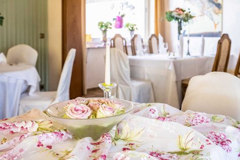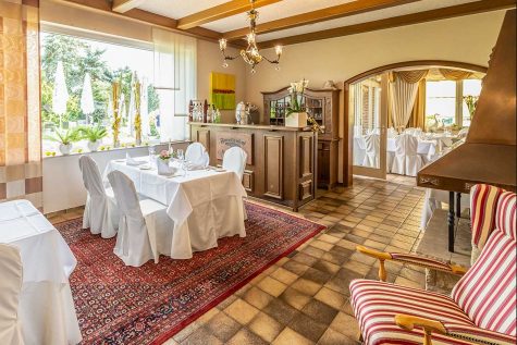 Unser Hauptraum ist das À-la-carte-Restaurant, in dem rund 25 Gäste Platz finden und in das man durch das Kaminzimmer gelangt.